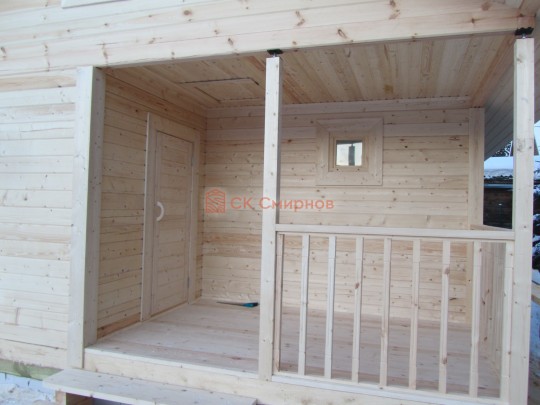 На террасе при условии что она есть делаем перила из строганной доски со всех сторон, столбы террасные также строганные, а не обрезки профилированного бруса с шипом и пазом. Домкратики на столбах для дальнейшей регулировки. Балясины будут сделаны аккуратно. Обратите внимание что в дешёвых случаях это может быть и будет просто вагонка прибирая к неотесанной доске снаружи и столбы будут не квадратные а просто профилированный брус как на видео.