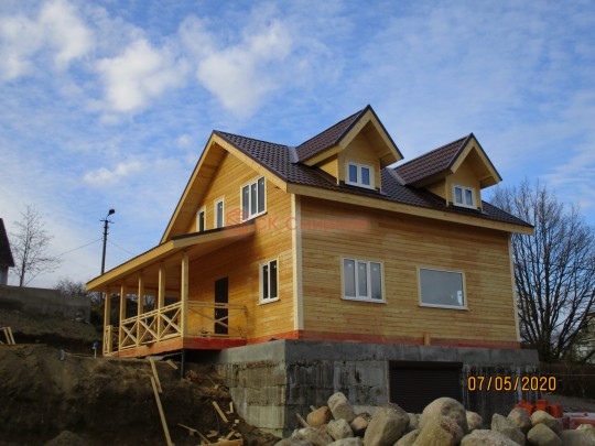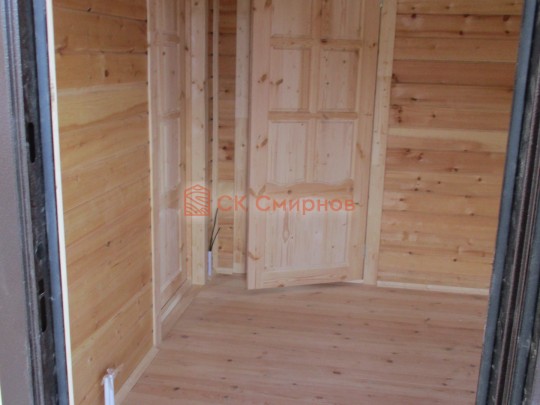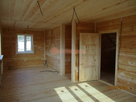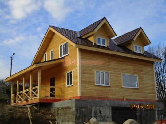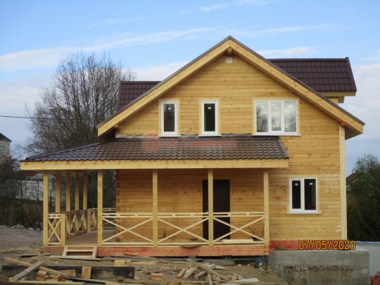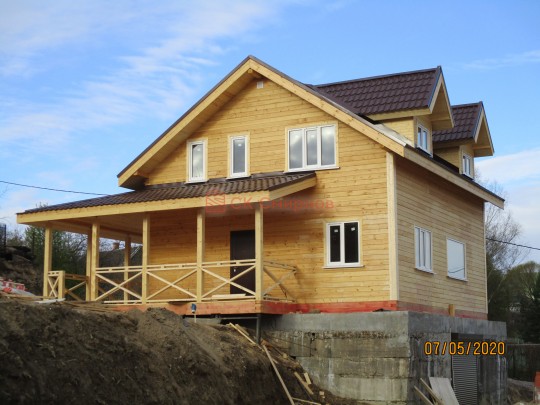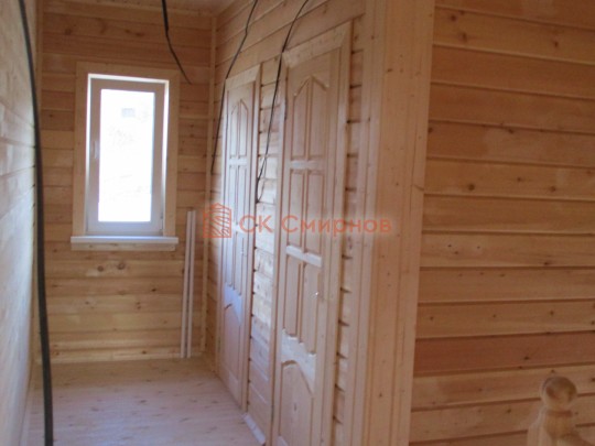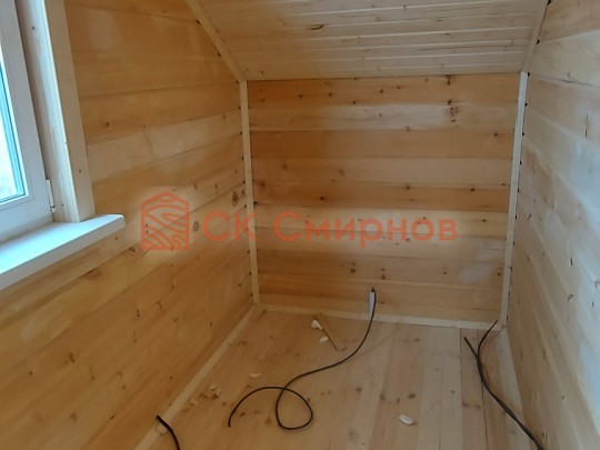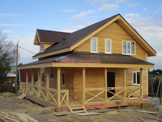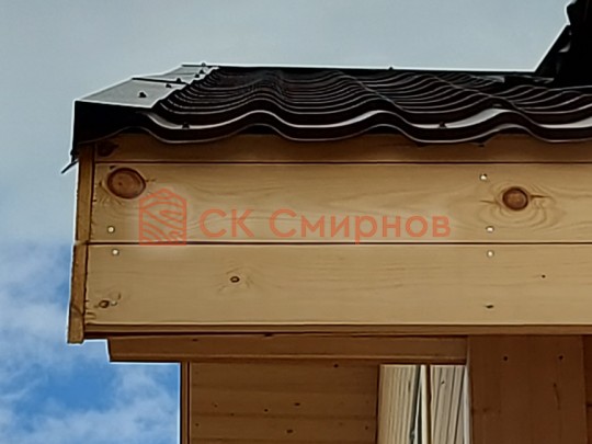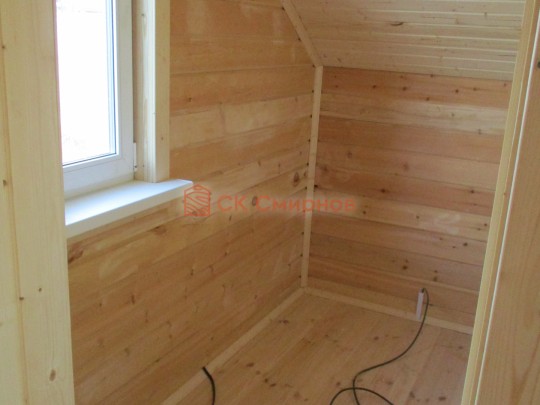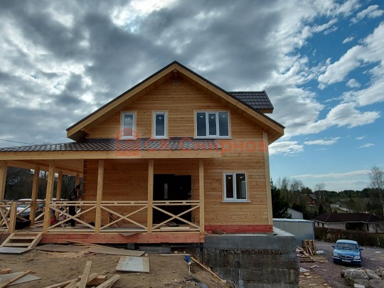 Из профилированного сухого бруса 9х14см, 14х14 см или 14х19 см. Сборка сруба в теплый угол на нагеля или гвозди 200 мм со сверлением отверстия в верхнем брусе (в зависимости от вида бруса).