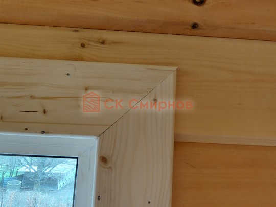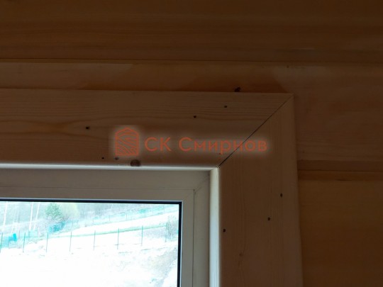 Обязательный элемент брусового дома или бани, это брусок в пиленный в брус в проем двери или окна не менее 50х50мм. Обязательно должен оставаться зазор сверху на усадку и этот брусок не должен быть жёстко закреплен в проеме. В некоторых случаях внутри помещения ставим металлические ройки, уточняйте. Посмотрите отрывок видео как могут повести себя стены