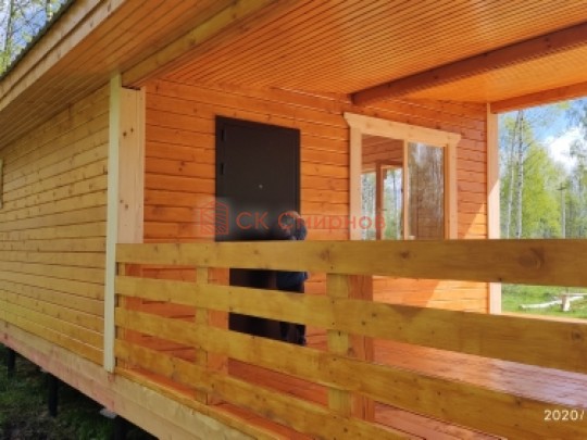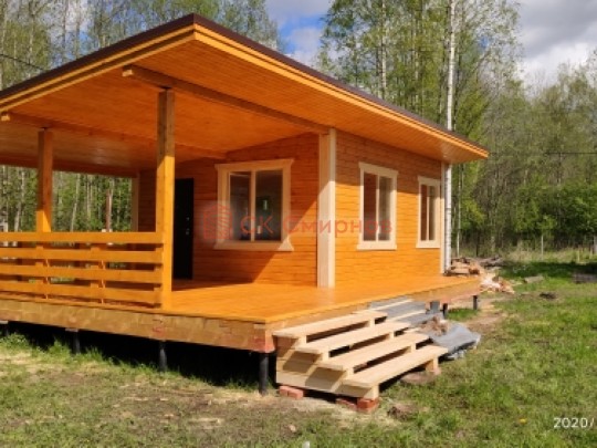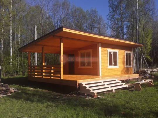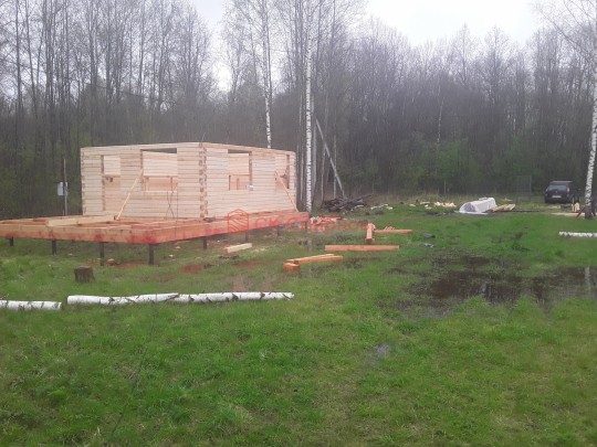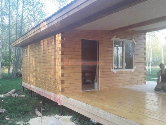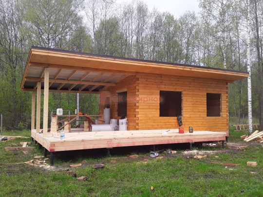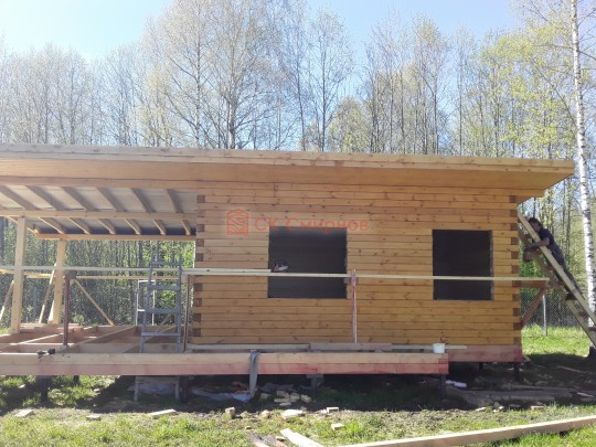 Из профилированного сухого бруса 9х14см, 14х14 см или 14х19 см. Сборка сруба в теплый угол на нагеля или гвозди 200 мм со сверлением отверстия в верхнем брусе (в зависимости от вида бруса).