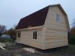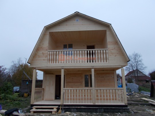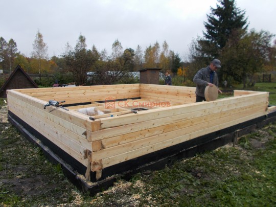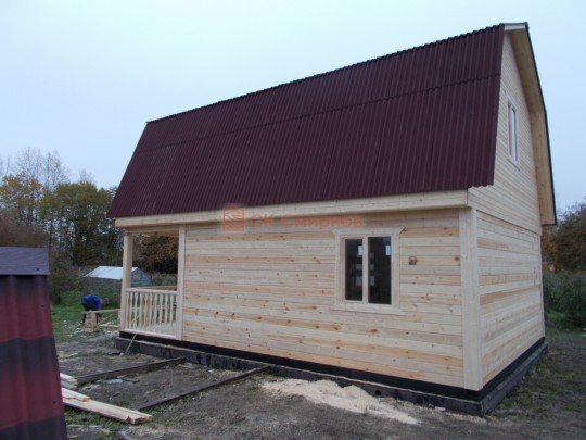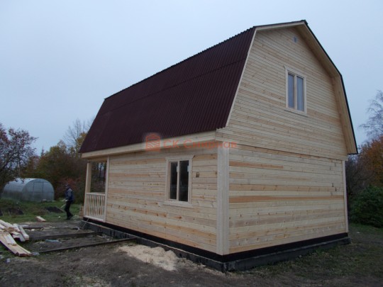 Из профилированного сухого бруса 9х14см, 14х14 см или 14х19 см. Сборка сруба в теплый угол на нагеля или гвозди 200 мм со сверлением отверстия в верхнем брусе (в зависимости от вида бруса).