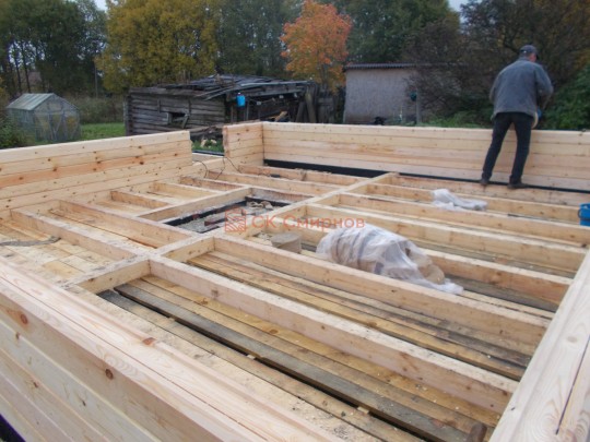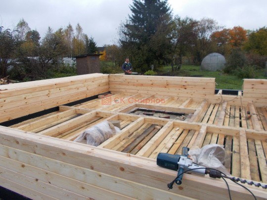 Лаги, обвязку и черновой пол обрабатываем раствором био огне защитой ( зимой оговариваются отдельные условия ), в основном красный цвет, но может быть и бесцветная обработка.